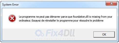 Pour corriger les erreurs liées au fichier .DLL, vous devez télécharger le fichier foundation.dll et le copier dans le dossier d'installation de l'application ou du jeu, ou le copier dans le dossier système de Windows et il devrait corriger l'erreur. Si vous ne savez pas comment installer ce fichier, veuillez lire notre tutoriel "Comment installer les fichiers DLL.